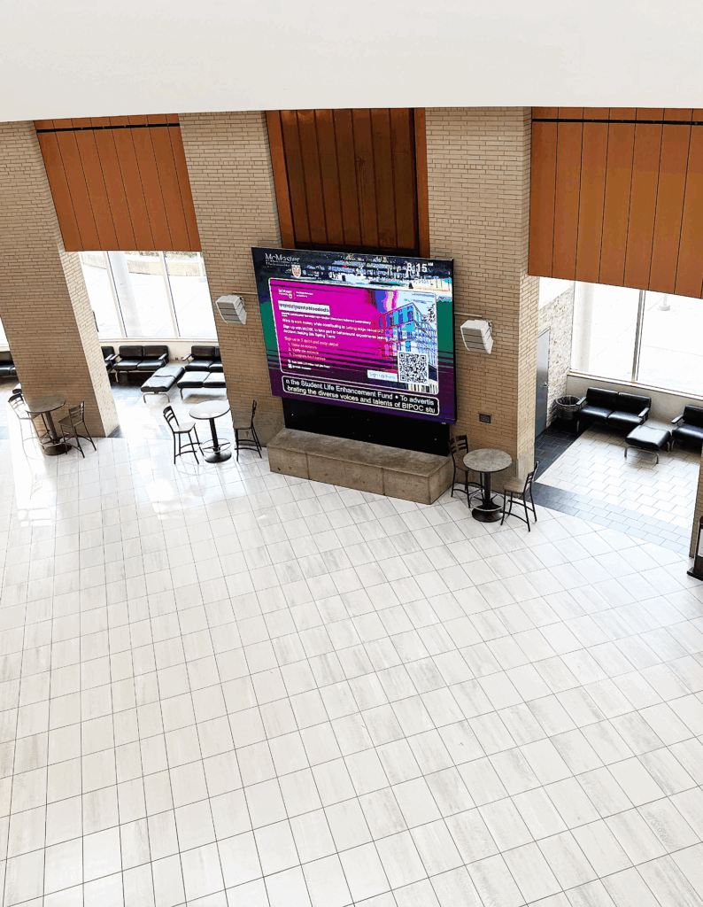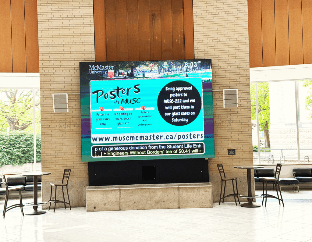 MUSC features big screen slides that showcase announcements, upcoming events, and important messages from MSU-recognized clubs, MSU departments, McMaster departments, faculty societies, and teams.